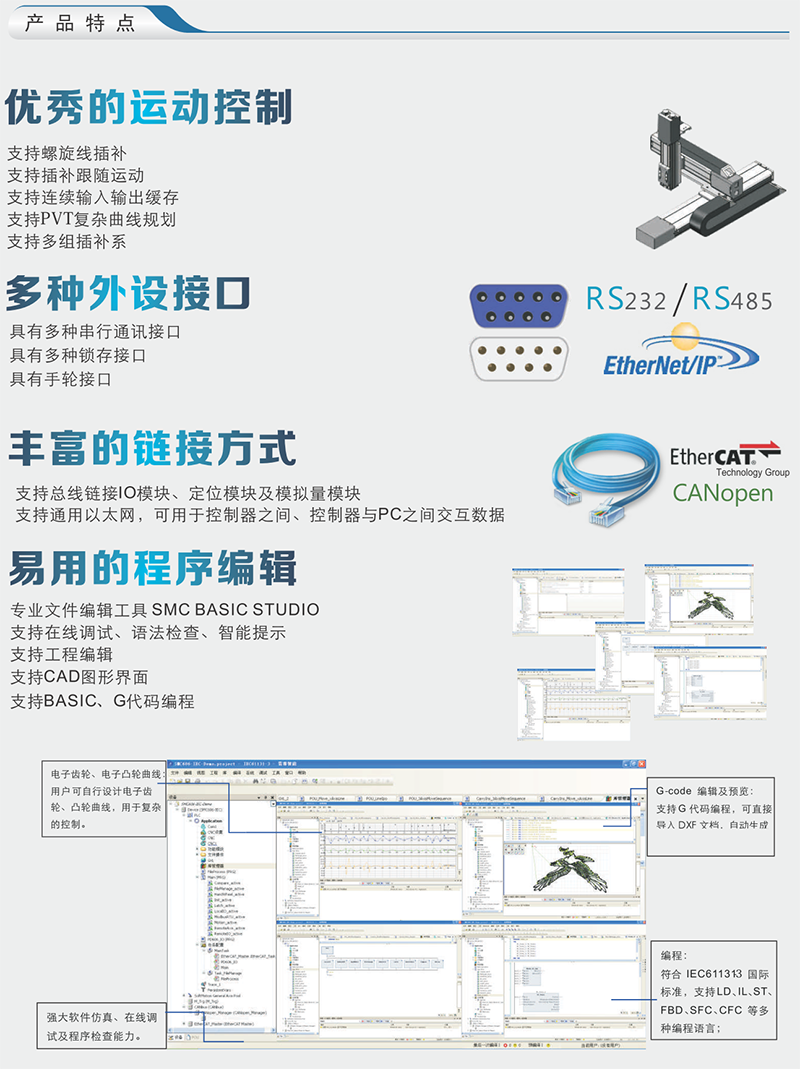雷赛智能的独立式运动控制器,与基于PC平台的运动控制卡产品一样非常丰富,覆盖了高中低端的运动控制需求。主要包括了SMC600系列高性能轨迹运动控制器、SMC6000系列基础型控制器、SMC3000系列经济型控制器、SMC100系列基础型独立式控制器等。控制器的种类有脉冲方向型、CANopen和EtherCAT总线等产品,支持PC编程、离线读取和存储用户程序等。